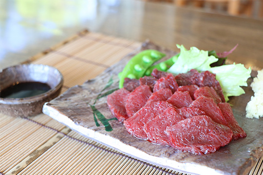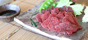 馬肉の刺身です。くさみが少なく、独特でコクのある味です。お客様の中には、お子様が好物とのことで注文される方もおいでです。