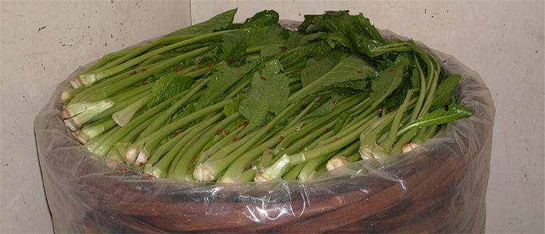 冬の野沢菜漬はホテル白樺荘の100%自家製です。山ノ内町で収穫された野沢菜を無添加、無着色、白樺荘の一石の漬物大樽ならではの発酵食品です。大変ご好評いただいております。