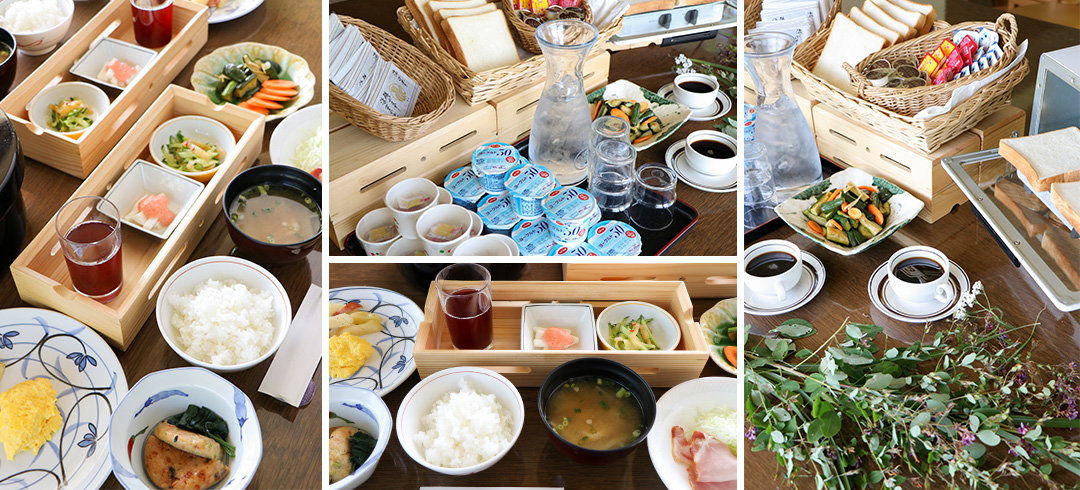 朝食は和食でご用意いたします。ジュース、小鉢類は日替わりメニューです。少種類のバイキングですが、ご自由にお取りいただけるヨーグルト、納豆などございます。