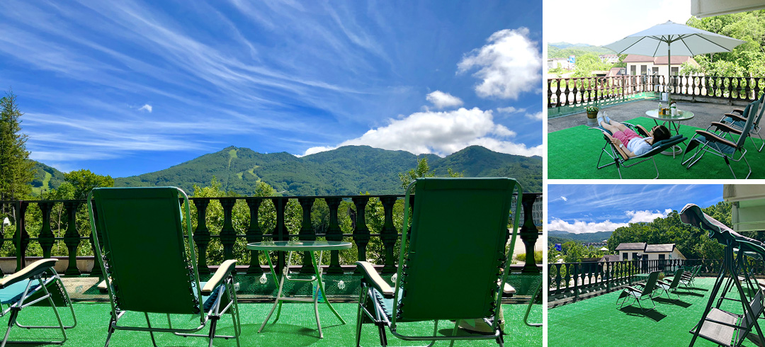 グリーンシーズン限定の3Fテラスで、山の空気を全身で感じながらリラックスしてください。