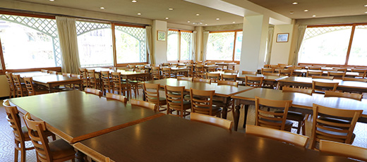 大きな窓から新緑が眩しい、明るく広々とした大食堂。