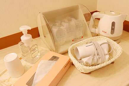 - バス、トイレ(洗浄機付)、洗面、冷蔵庫(セルフ用)、電話、テレビ、ドライヤー、電気ケトル